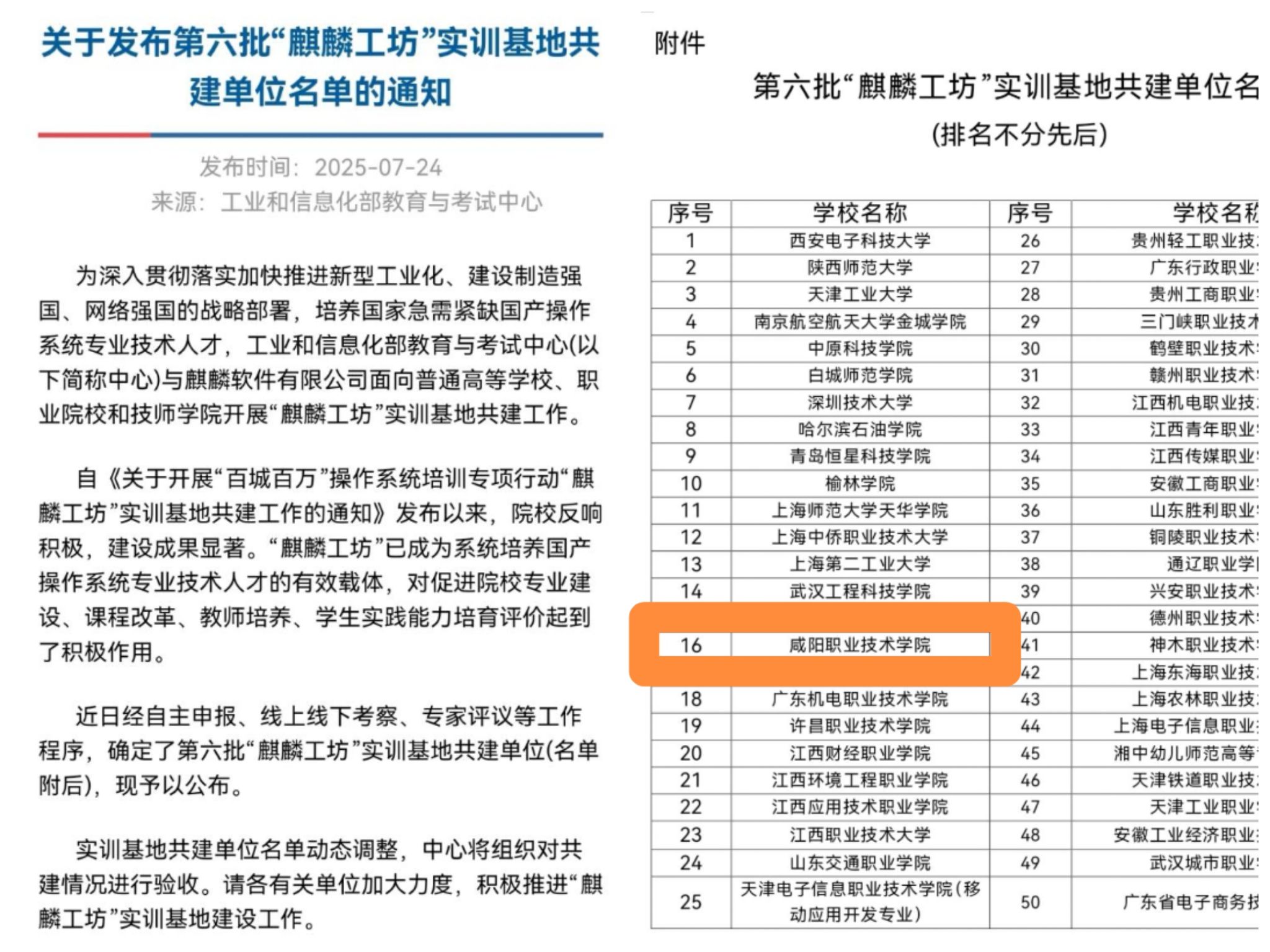近日,工业和信息化部教育与考试中心正式发布《关于发布第六批“麒麟工坊”实训基地共建单位名单的通知》,beat365唯一官方网站凭借在信息技术领域深厚的办学实力与突出的产教融合成效,成功跻身全国50所获批院校行列,标志着学院在服务国家信息技术应用创新战略与培养高素质技术技能人才方面再获国家级平台支撑。