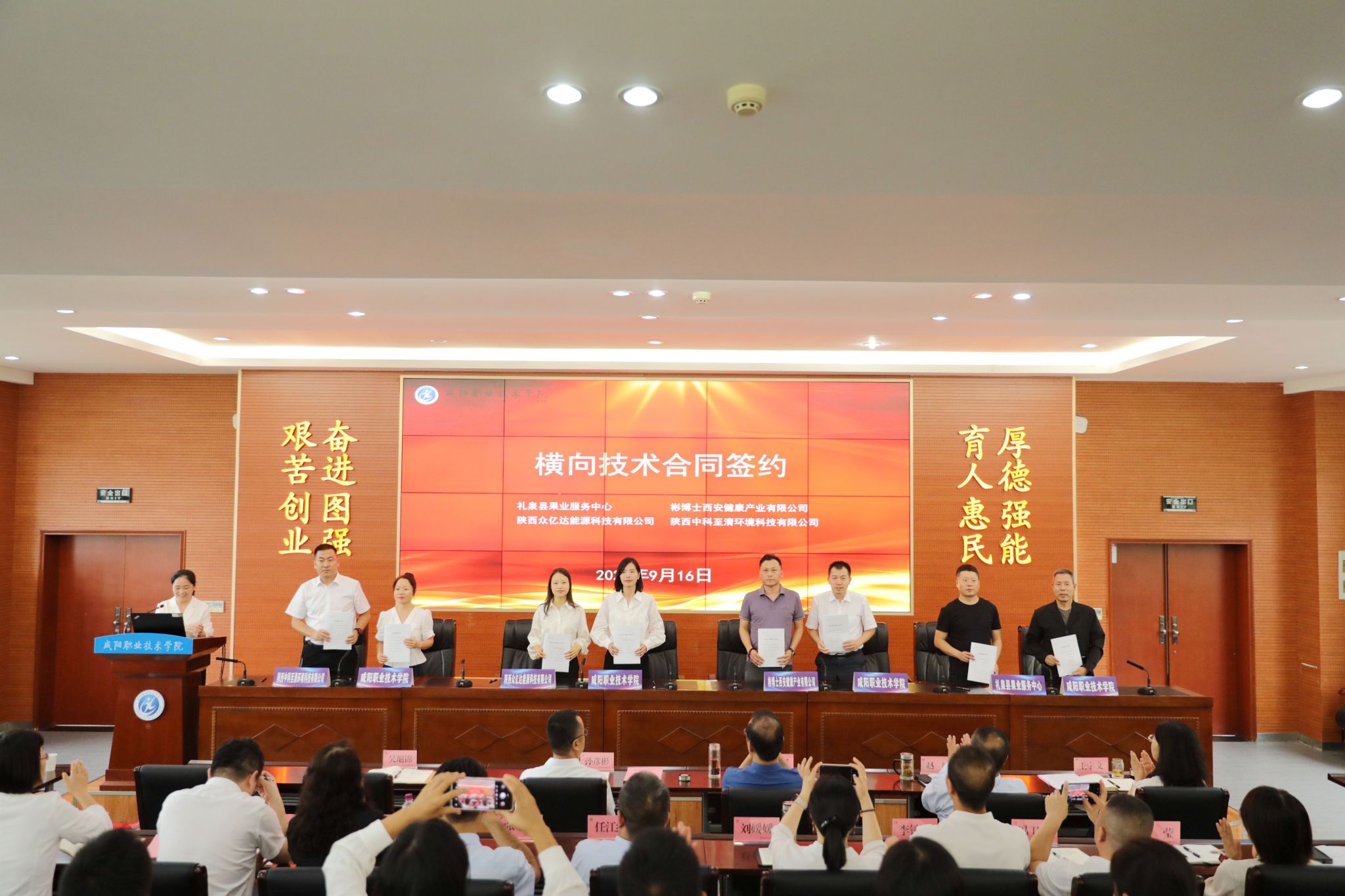 随后,会议举行了横向技术合同签约仪式。王军利等4位老师分别与礼泉县果业服务中心、彬博士西安健康产业有限公司、陕西众亿达能源科技有限公司、陕西中科至清环境科技有限公司签署技术合作合同。这批项目的签约,是学院“立地科研”服务地方产业的直接体现,标志着学院产学研合作实现新突破。