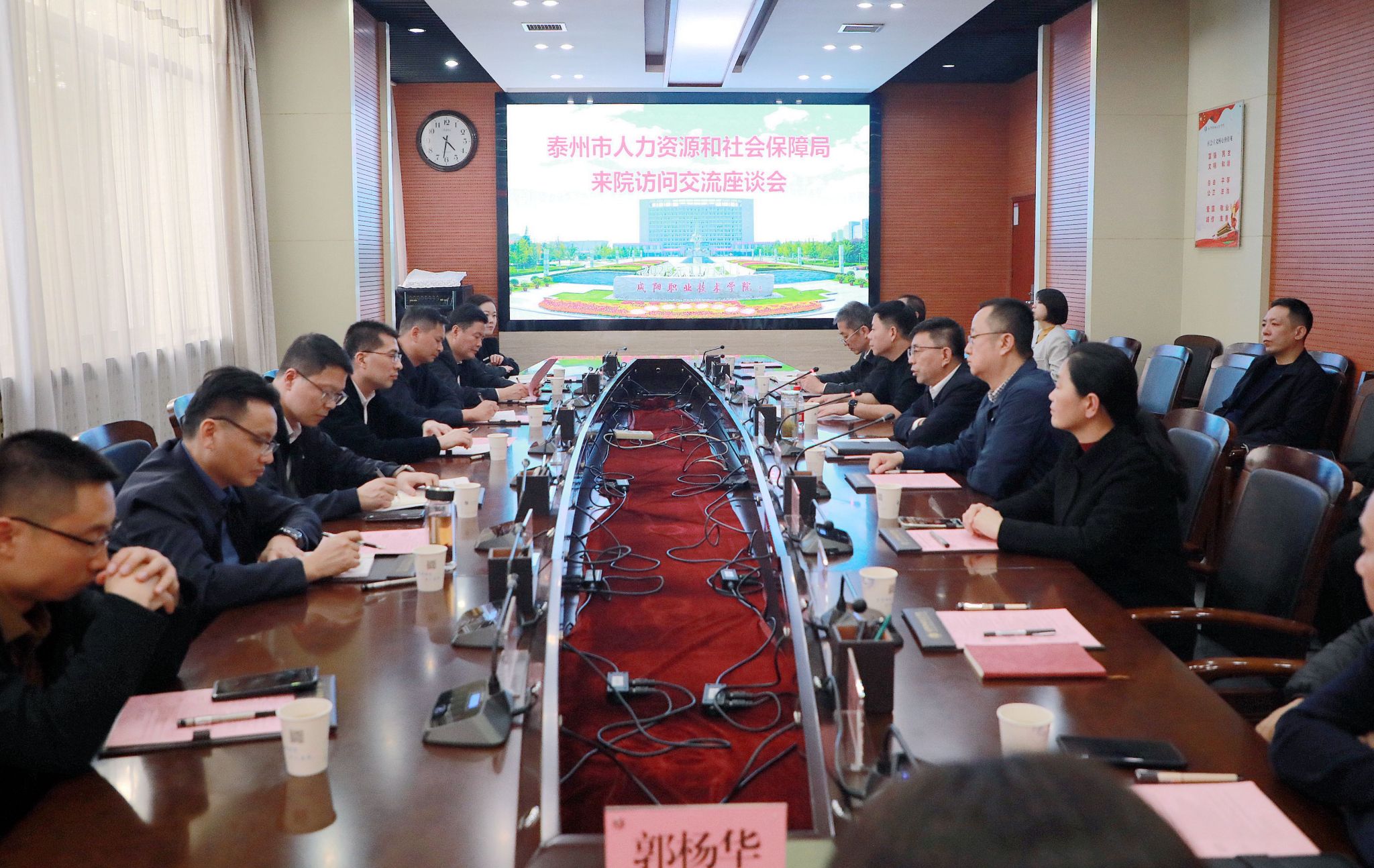 11月4日,泰州市人力资源和社会保障局党组书记、局长吉志铭一行7人到咸阳职院访问交流。咸阳市人社局党组书记、局长李卫东,咸阳市人社局副局长冯朝阳,咸阳职院党委副书记、工会主席孙彦彬,副院长吴旭锦陪同。泰州市人社局、咸阳市人社局、咸阳职院相关工作负责人参加交流活动。会议由冯朝阳主持。