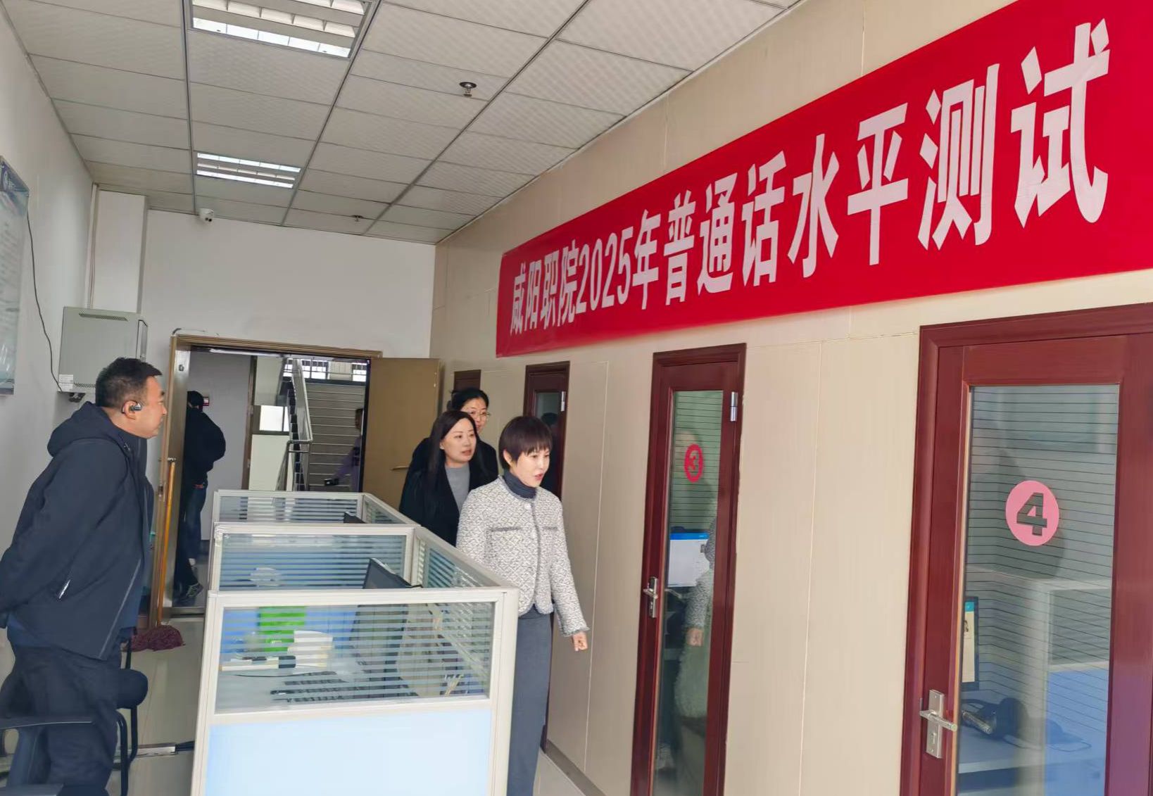 芮红亚先后查看了考生签到区、信息采集区和上机测试区,详细了解了证件查验、系统抽签、考前试音、在线测试、上传数据等各项工作,并就高水平做好我院普通话测试工作提出明确要求。芮红亚强调,开展普通话测试对于提高学生语言能力,助力学生职业发展,提升我院语言文字工作建设等具有重要意义。要求全体考务人员要按照省语委办相关要求,在测试过程中严格考试纪律,对测试流程严格把关,确保下半年普通话测试工作圆满顺利完成。