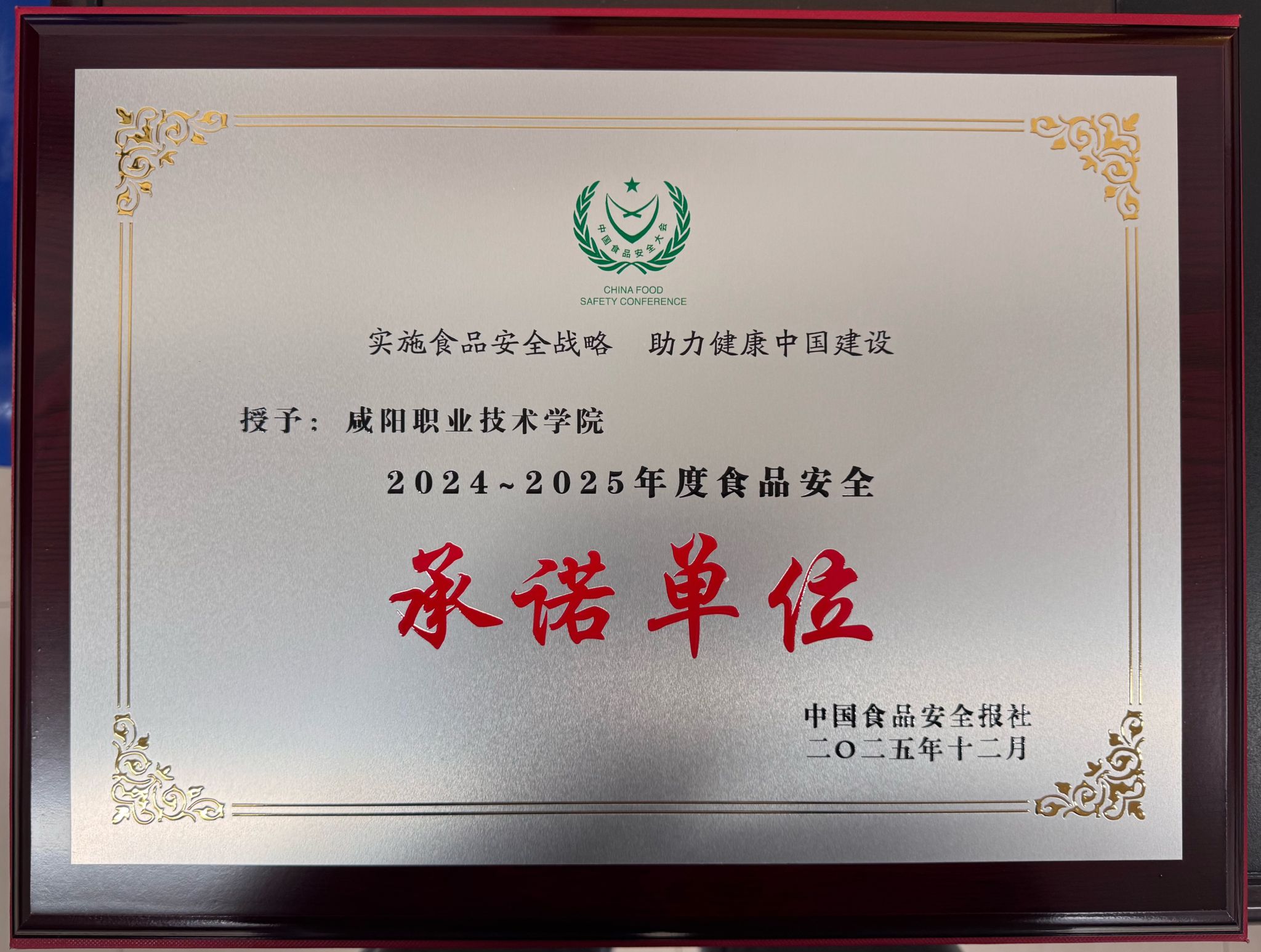 近日,第二十三届中国食品安全大会暨2025全国食品工业科技进步大会在北京召开。咸阳职院因在食品安全教育与校园食育体系建设方面的突出成绩,被授予“2024-2025年度中国食品安全管理承诺单位”称号,特色育人案例成功入选“中国食品安全管理优秀案例”。这一双重荣誉的获得,标志着学院在贯彻落实“健康中国”战略、探索高职院校食品安全育人路径方面有了一定成效,形成了可推广、可复制的“咸阳职院经验”。