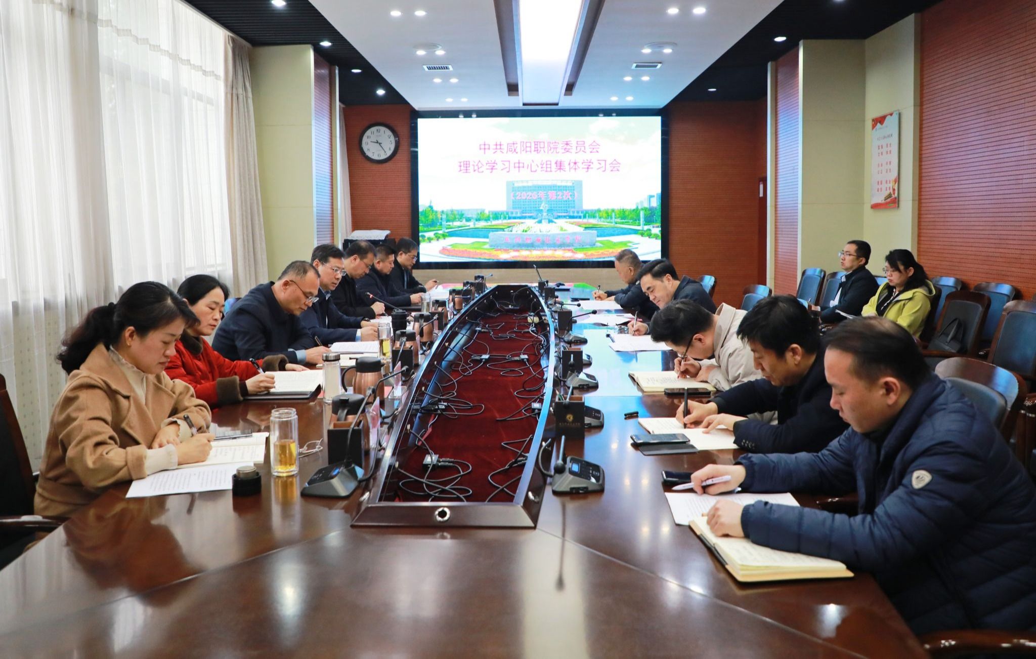 3月4日,咸阳职院党委理论学习中心组召开2026年第2次集体学习会。学院党委书记张迪,院长杨卫军,党委副书记杨新宇,副院长吴旭锦、雷建辉、冯华、宋飞科和理论学习中心组全体成员参加学习。张迪主持会议。