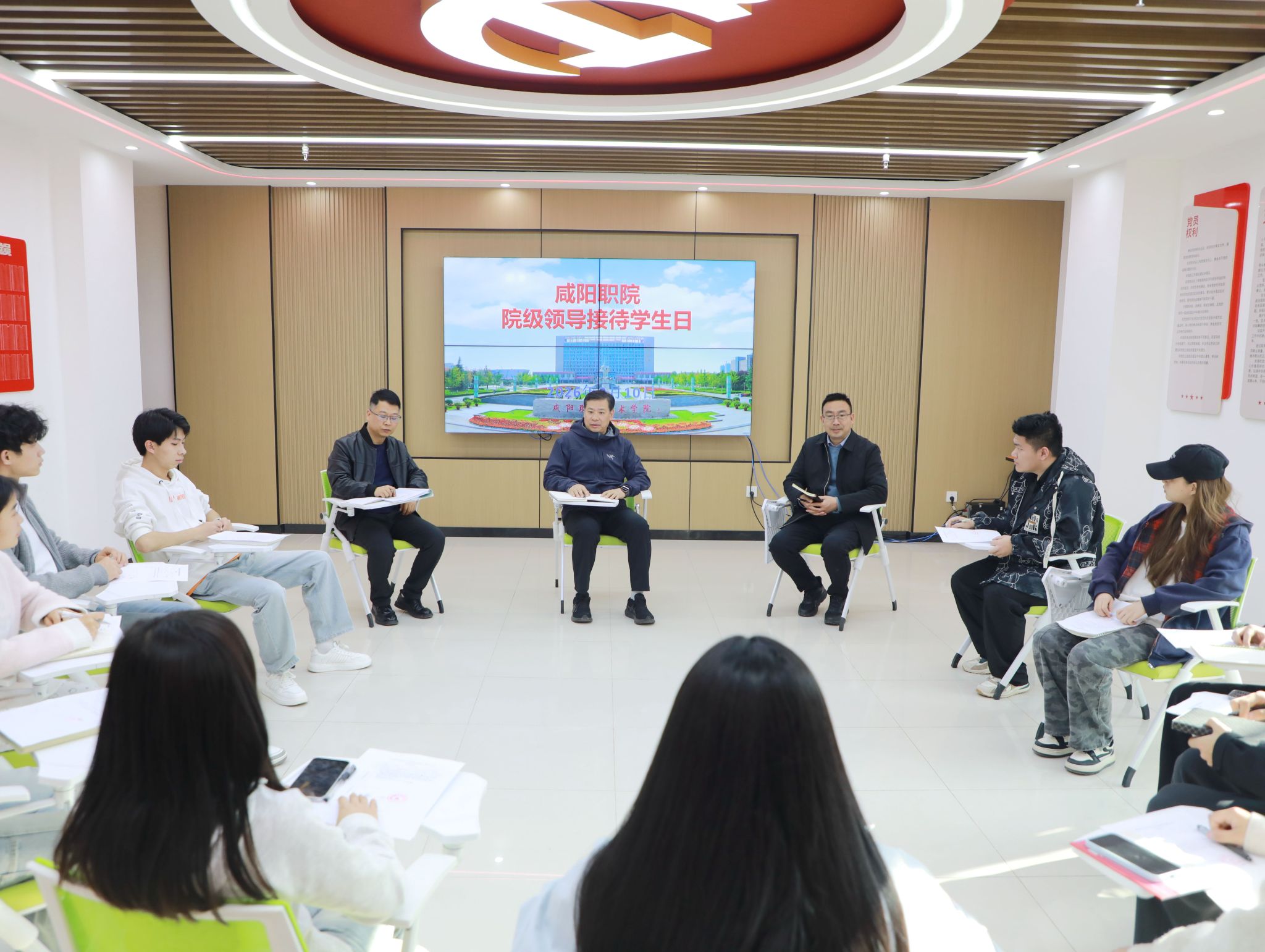 3月10日,咸阳职院在学院“一站式”学生社区学生党团活动中心开展院领导接待日活动。学院党委书记张迪与来自各二级学院的学生代表围坐交流,倾听学生心声,回应诉求期盼,共话校园建设与成长发展。