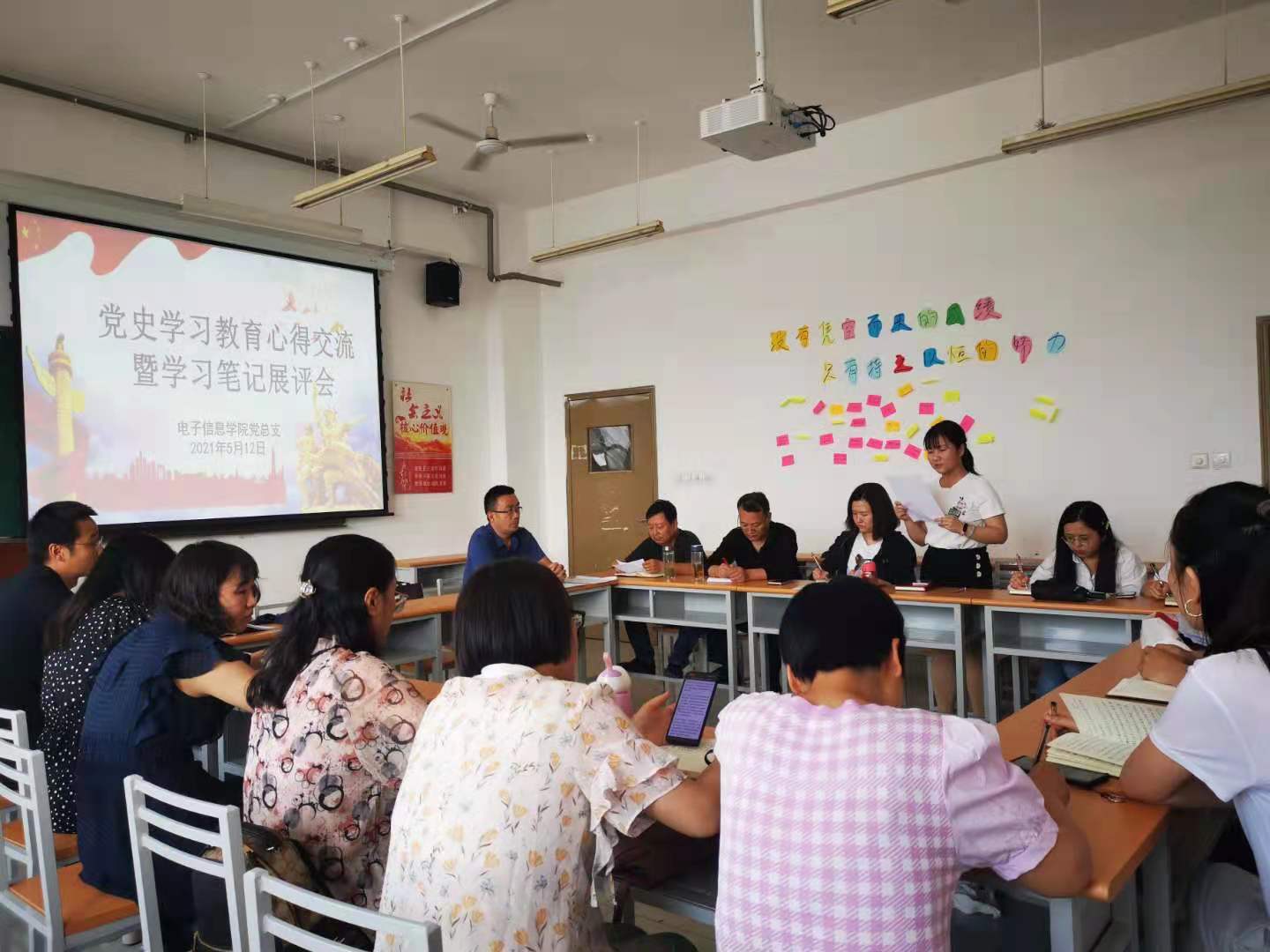 为深入推进党史学习教育走深走实,入心入脑,5月12日,电子信息学院党总支在教学楼712召开党史学习教育心得交流暨学习笔记展评会。